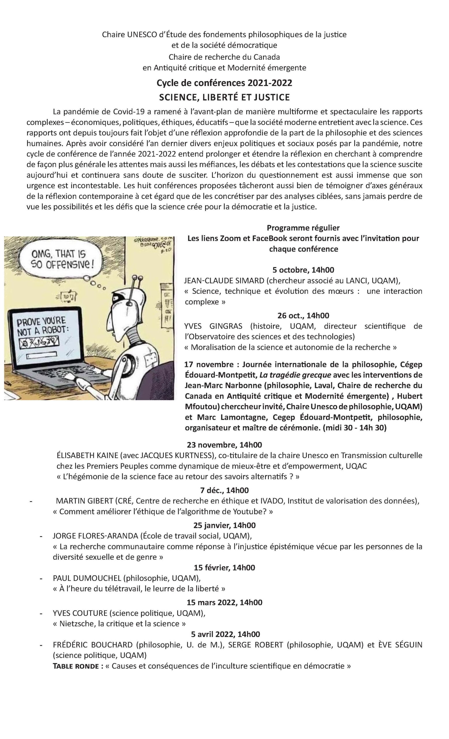 Cycle de conférences 2021-2022 SCIENCE, LIBERTÉ ET JUSTICE La pandémie de Covid-19 a ramené à l’avant-plan de manière multiforme et spectaculaire les rapports complexes – économiques, politiques, éthiques, éducatifs – que la société moderne entretient avec la science. Ces rapports ont depuis toujours fait l’objet d’une réflexion approfondie de la part de la philosophie et des sciences humaines. Après avoir considéré l’an dernier divers enjeux politiques et sociaux posés par la pandémie, notre cycle de conférence de l’année 2021-2022 entend prolonger et étendre la réflexion en cherchant à comprendre de façon plus générale les attentes mais aussi les méfiances, les débats et les contestations que la science suscite aujourd’hui et continuera sans doute de susciter. L’horizon du questionnement est aussi immense que son urgence est incontestable. Les huit conférences proposées tâcheront aussi bien de témoigner d’axes généraux de la réflexion contemporaine à cet égard que de les concrétiser par des analyses ciblées, sans jamais perdre de vue les possibilités et les défis que la science crée pour la démocratie et la justice. Les liens Zoom et FaceBook seront fournis avec l’invitation pour chaque conférence. Séance du 15 février 2022 PAUL DUMOUCHEL (philosophie, UQAM) (date à confirmer), « À l’heure du télétravail, le leurre de la liberté »