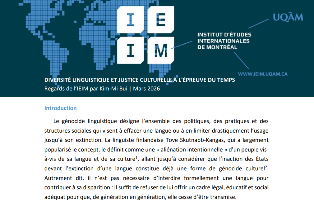 Dans le cadre de la série Regards de l’IEIM, nous avons le plaisir de vous proposer le neuvième texte retenu à la suite de l’appel à propositions 2025-2026 sur le thème des alliances et des résistances, qui s’intitule Diversité linguistique et justice culturelle à l’épreuve du temps.