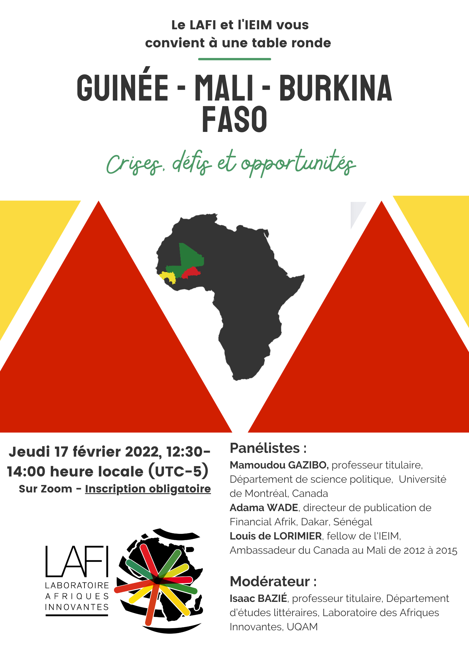 Table ronde : « Guinée – Mali – Burkina Faso: Crises, défis et opportunités », organisée par le Laboratoire des Afriques innovantes (LAFI), avec l’appui de l’Institut d’études internationales de Montréal (IEIM)
