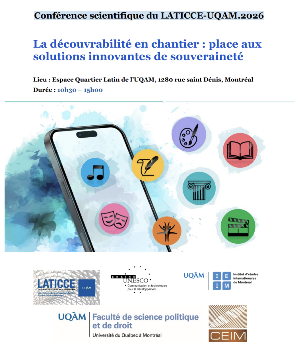 Le Laboratoire de recherche sur la découvrabilité et les transformations des industries culturelles à l’ère du commerce électronique (LATICCE) et la Chaire UNESCO en communication et technologies pour le développement vous invitent à son évènement « La découvrabilité en chantier : place aux solutions innovantes de souveraineté » le 20 mai 2026 de 10h30 à 15h00.