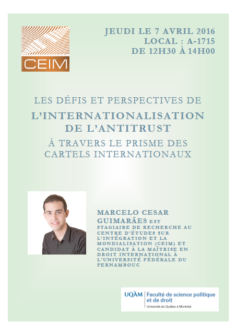Les défis et perspectives de l’internationalisation de l’antitrust à travers le prisme des cartels internationaux Marcelo Guimaraes L’accélération de la mondialisation modifie l’économie par la création de systèmes globaux de production et de chaînes de valeur globales, et les entreprises multinationales gagnent en pouvoir et en influence. Dans ce contexte, il y a une émergence de cartels internationaux, c’est-à-dire des ententes entre entreprises ayant des opérations simultanées dans plus d’un pays pour contrôler le marché, limiter la concurrence et maximiser leurs profits. Toutefois, tandis que les firmes multinationales ont étendu la toile de leurs activités à l’échelle planétaire, la gouvernance n’a pas suivi. Ainsi, aujourd’hui, la régulation économique « stato-centrée » est inefficace, de sorte que plusieurs défis sont posés aux autorités nationales de la concurrence. Dans cette perspective, la recherche vise à analyser les cartels internationaux, en identifiant les efforts déployés par les pays pour internationaliser leurs politiques et droits de la concurrence et rendre le combat à ces ententes plus efficace.