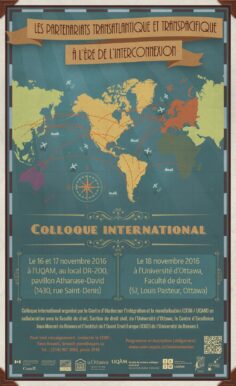 Les conférenciers partageront leur approche d’analyse tout en cherchant spécifiquement à dresser un état des lieux et à présenter des pistes d’analyse et de recherche pour comprendre : l’évolution des processus de l’intégration vers les nouvelles dynamiques d’interconnexion dans les Amériques ; les implications juridiques et institutionnelles ainsi que les nouveaux enjeux (coopération règlementaire, commerce-culture ; clauses sociales, droits humains, télécommunications et commerce électronique, propriété intellectuelle, investissements et règlement des différends …) liés à la reconfiguration des relations transatlantiques; les mises en perspective des expériences américaines, européennes et asiatiques et la comparaison des caractéristiques entre les accords antérieurs et les nouveaux partenariats. Le Colloque international est organisé par le Centre d’études sur l’intégration et la mondialisation (CEIM / UQAM) en collaboration avec la Faculté de droit, Section de droit civil, de l’Université d’Ottawa, le Centre d’Excellence Jean-Monnet de Rennes et l’Institut de l’Ouest Droit Europe (IODE) de l’Université de Rennes 1. Programme du Colloque International – Les partenariats transatlantique et transpacifique à l’ère de l’interconnexionBiographies des conférenciers