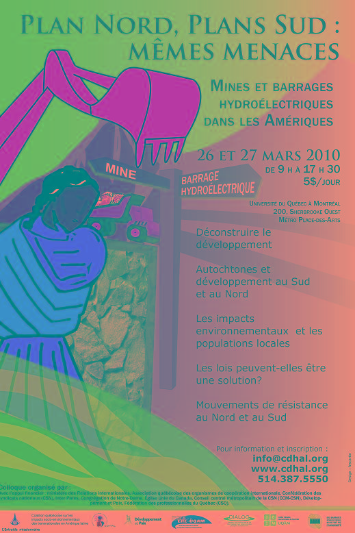 – 5) les mouvements de résistance au nord et au sud. Ce colloque réunit plusieurs représentants de la société civile dont Ghislain Picard, Chef de l’Assemblée des Premières Nations du Québec et du Labrador ; Daniel Green, Société pour vaincre la pollution ; Ugo Lapointe de la Coalition pour que le Québec ait meilleur mine ; aussi des invités internationaux tel Bernardo Belloso, Comité chrétien pour les déplacés au Salvador ; Abraham Rivera du Centro de investigaciones económicas y politicas de acción comunitaria ;Soniamara Maranho du Mouvement des personnes affectées par les barrages au Brésil (MAB) ; et des chercheurs universitaires reconnus comme Lucie Sauvé, titulaire de la Chaire de recherche du Canada en éducation relative à l’environnement (UQAM) ; Thora Martina Herrmann, titulaire de la Chaire de recherche du Canada en ethnoécologie et conservation de la biodiversité (UdM) ; et Dorval Brunelle, directeur de l’Institut d’études internationales de Montréal (UQAM). Pour les inscriptions ou pour plus d’information, contactez :