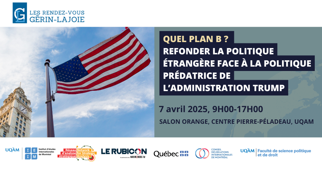 Conférence organisée conjointement par l’Institut d’études internationales de Montréal (IEIM), le Réseau d’analyse stratégique et Le Rubicon, avec le soutien de la Faculté de science politique et de droit de l’UQAM, dans le cadre des Rendez-vous Gérin-Lajoie. Cette journée, consacrée aux questions de sécurité et de défense, permettra de faire le point sur la période de crise historique que connaît le Canada, alors que sa souveraineté est directement menacée.