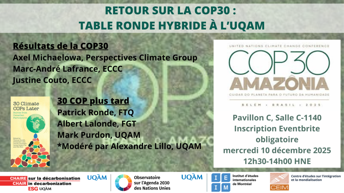 La Chaire sur la décarbonisation, en collaboration avec l’Observatoire sur l’Agenda 2030 des Nations Unies, l’Institut d’études internationales de Montréal (IEIM) et le Centre d’études sur l’intégration et la mondialisation (CEIM) vous invite à l’événement Retour sur la COP30 : Enjeux de gouvernance climatique, qui se tiendra le mercredi 10 décembre 2025, de 12h30 à 14h00, dans la salle C-1140 du Pavillon C de l’ESG-UQAM. L’événement est gratuit et ouvert à la communauté universitaire et au grand public.