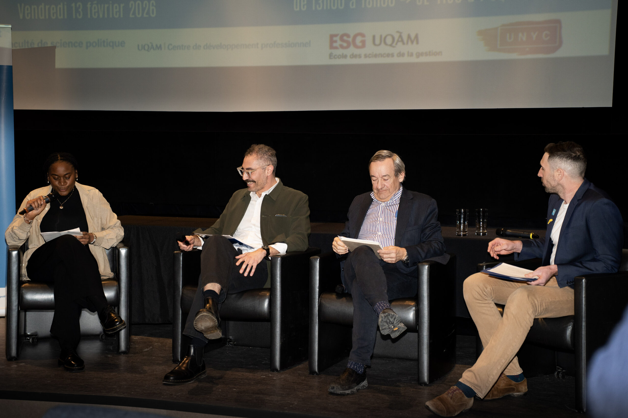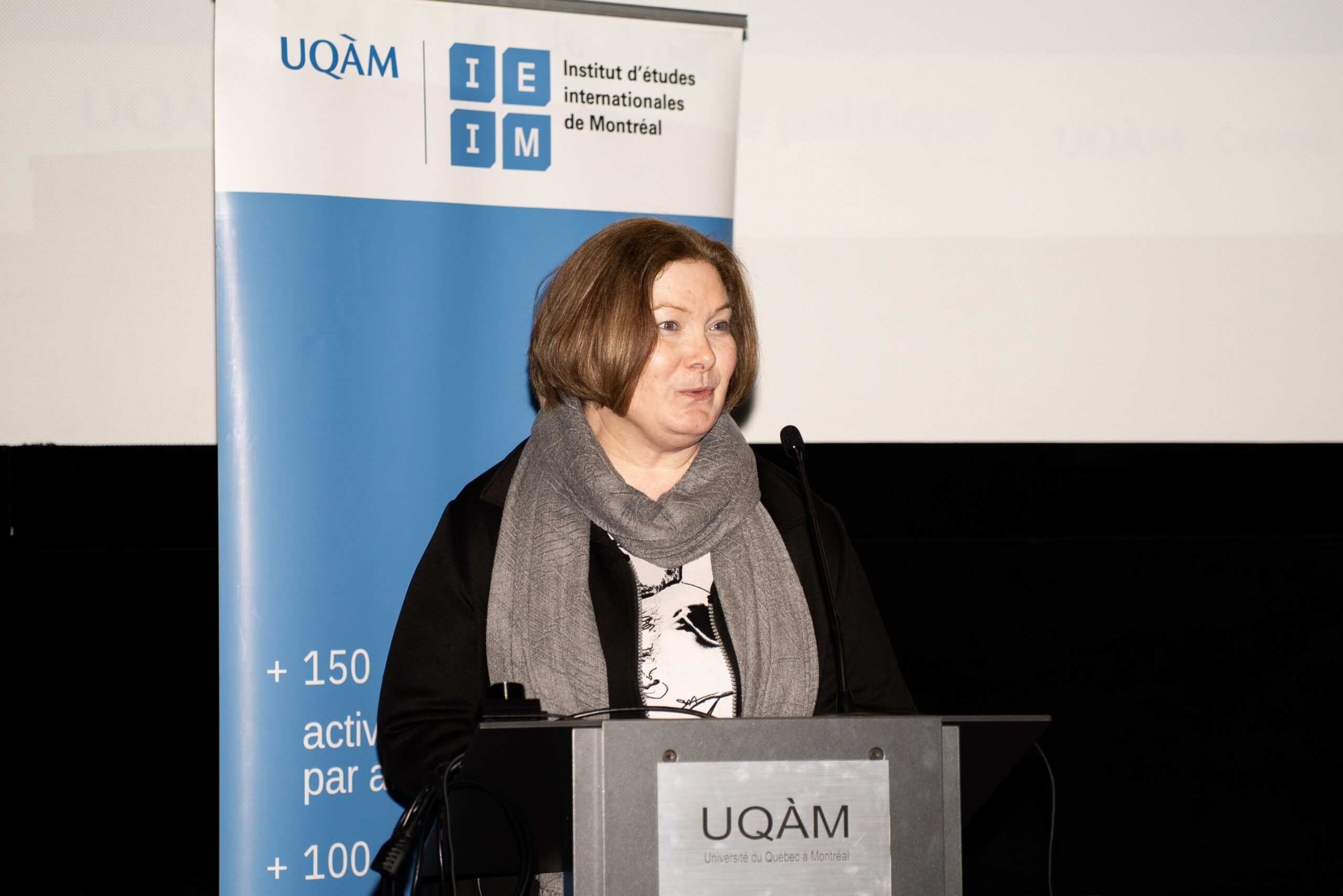 - les panélistes, expert·es universitaires, de la diplomatie et du monde socioéconomique, qui ont livré leurs impressions sur les questions de commerce international, économie mondiale, questions humanitaires et migratoires, diplomatie et ONU: Anne Leahy, ex-ambassadrice canadienne, fellow et ancienne directrice de l’IEIM, Florian Mayneris, professeur au Département d’économie de l’ESG-UQAM, Julie Francoeur, directrice générale, Fairtrade Canada, Ndeye Dieynaba Ndiaye, professeure au Département des sciences juridiques de l’UQAM, François Audet, professeur à l’ESG-UQAM, directeur de l’IEIM et de l’OCCAH, Nadja Pollaert, directrice générale de Médecins du Monde Canada, Joey Hanna, Chef de bureau à Montréal, Haut-Commissariat des Nations Unies pour les réfugiés, Gilles Rivard, ex-ambassadeur du Canada en Haïti, ex-ambassadeur et représentant permanent adjoint du Canada auprès des Nations Unies à New York, fellow à l’IEIM, Romain Lecler, professeur au Département de science politique de l’UQAM.