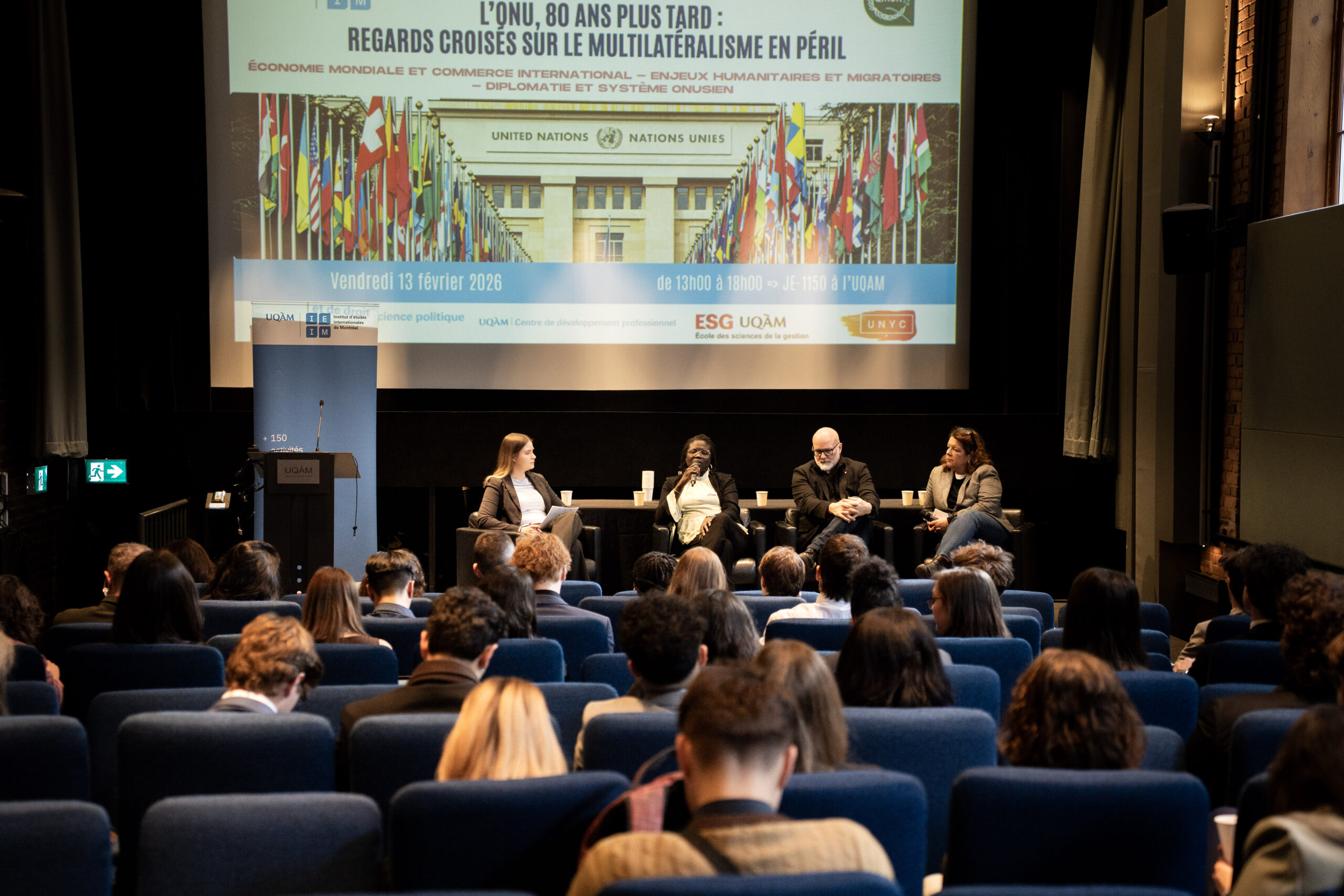 L’événement avait lieu à la salle JE-1150 de l’UQAM. Il était destiné à des personnes étudiantes provenant de différents établissements collégiaux et universitaires du Québec et de la région d’Ottawa, désireuses d’en savoir plus sur les nombreux défis auxquels les Nations Unies et plus largement, le multilatéralisme, sont confrontés.