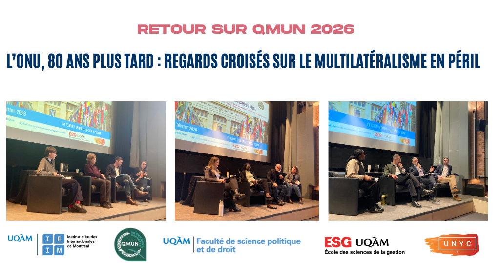 Le 13 février dernier, dans le cadre de la 27e édition de la Simulation québécoise des Nations Unies (QMUN), l’Institut d’études internationales de Montréal (IEIM) a eu le plaisir de présenter une demi-journée de tables rondes, en collaboration avec la Faculté de science politique et de droit de l’UQAM, l’École des sciences de la gestion (ESG-UQAM) ainsi que l’Association des jeunes canadiens pour les Nations unies (AJCNU).