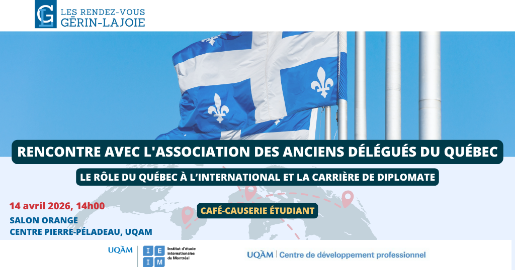 Dans le cadre de la sixième édition des Rendez-vous Gérin-Lajoie, l’Institut d’études internationales de Montréal (IEIM) et le Centre de développement professionnel de la Faculté de science politique et de droit sont heureux de convier la communauté étudiante de l’UQAM à une rencontre avec des membres de l’Association des anciens délégués du Québec. La rencontre aura lieu le mardi 14 avril 2026, de 14h00 à 15h30 au salon Orange du Centre Pierre-Péladeau de l’UQAM.