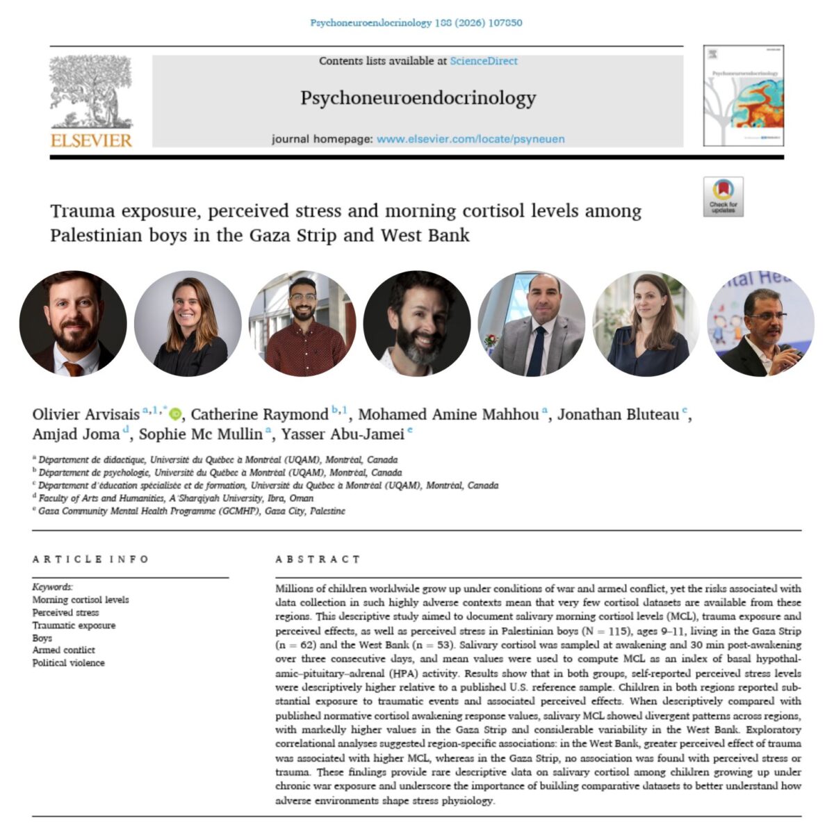Un nouvel article vient de paraître dans la revue Psychoneuroendocrinology (Volume 188, 2026), portant sur les relations entre l’exposition au trauma, le stress perçu et les niveaux de cortisol chez des garçons palestiniens vivant dans la bande de Gaza et en Cisjordanie.