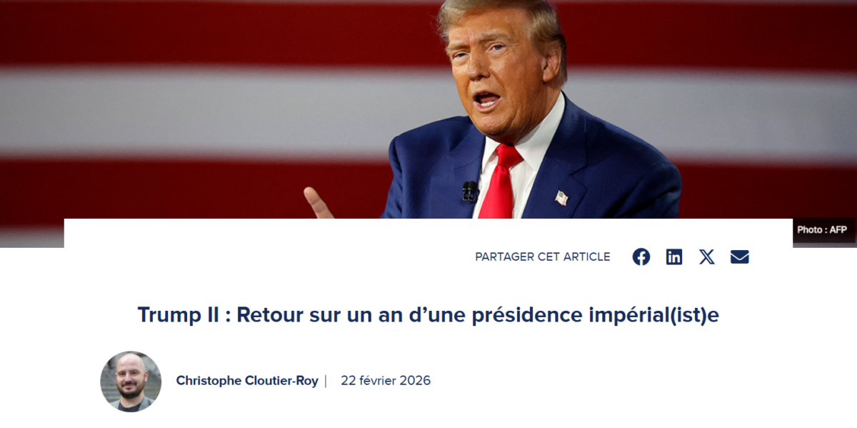 Christophe Cloutier-Roy, directeur adjoint de l’Observatoire sur les États-Unis de la Chaire Raoul-Dandurand et professeur associé à l’Institut d’études internationales de Montréal (IEIM) a publié un article pour le Blogue du CORIM intitulé « Trump II : Retour sur un an d’une présidence impérial(ist)e ».